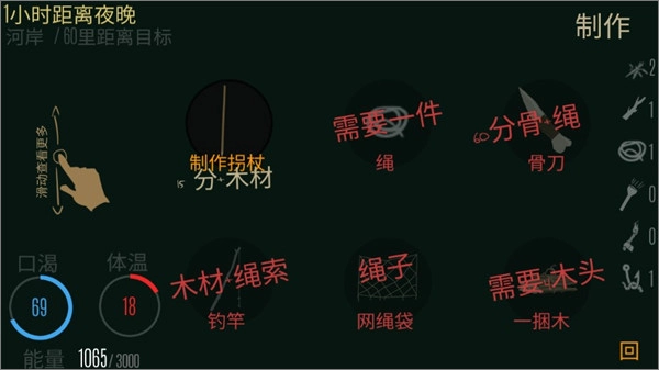 游戲開局就朝著湖泊狂奔,到了之后先搭帳篷,接著伐木生火,再把繩子切割成魚竿;牛肉要全部做成牛肉干,別吃(其他東西都吃掉),這些牛肉干全都用來釣魚。