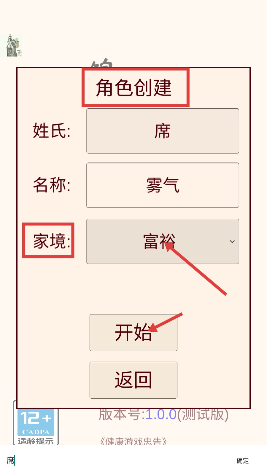 在進行【角色創建】的過程中,可以選擇【家境-富裕】這一選項,填寫好姓氏名稱后點擊【開始】按鈕,就能進入游戲開啟屬于你的錦衣衛生涯了。
