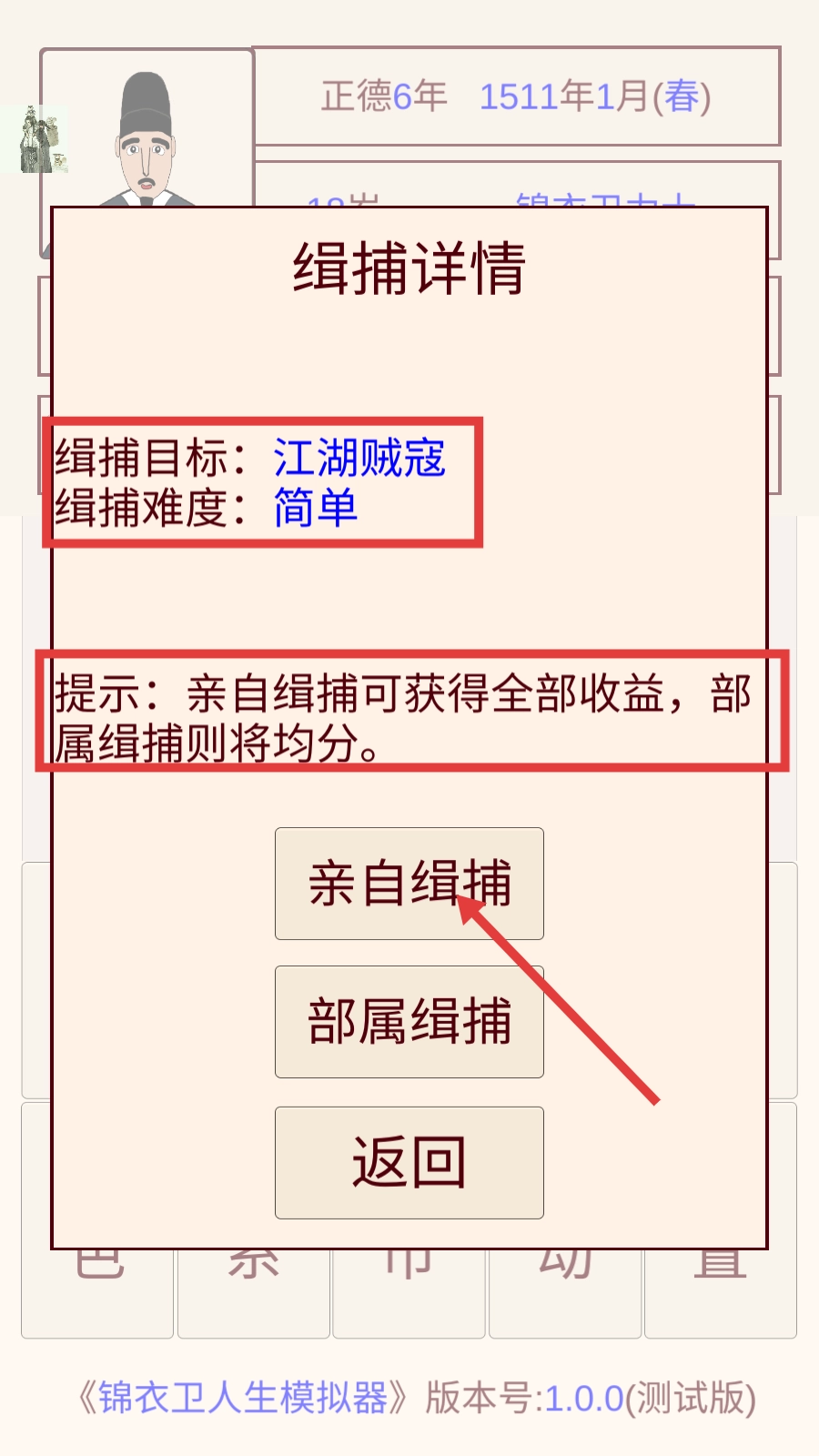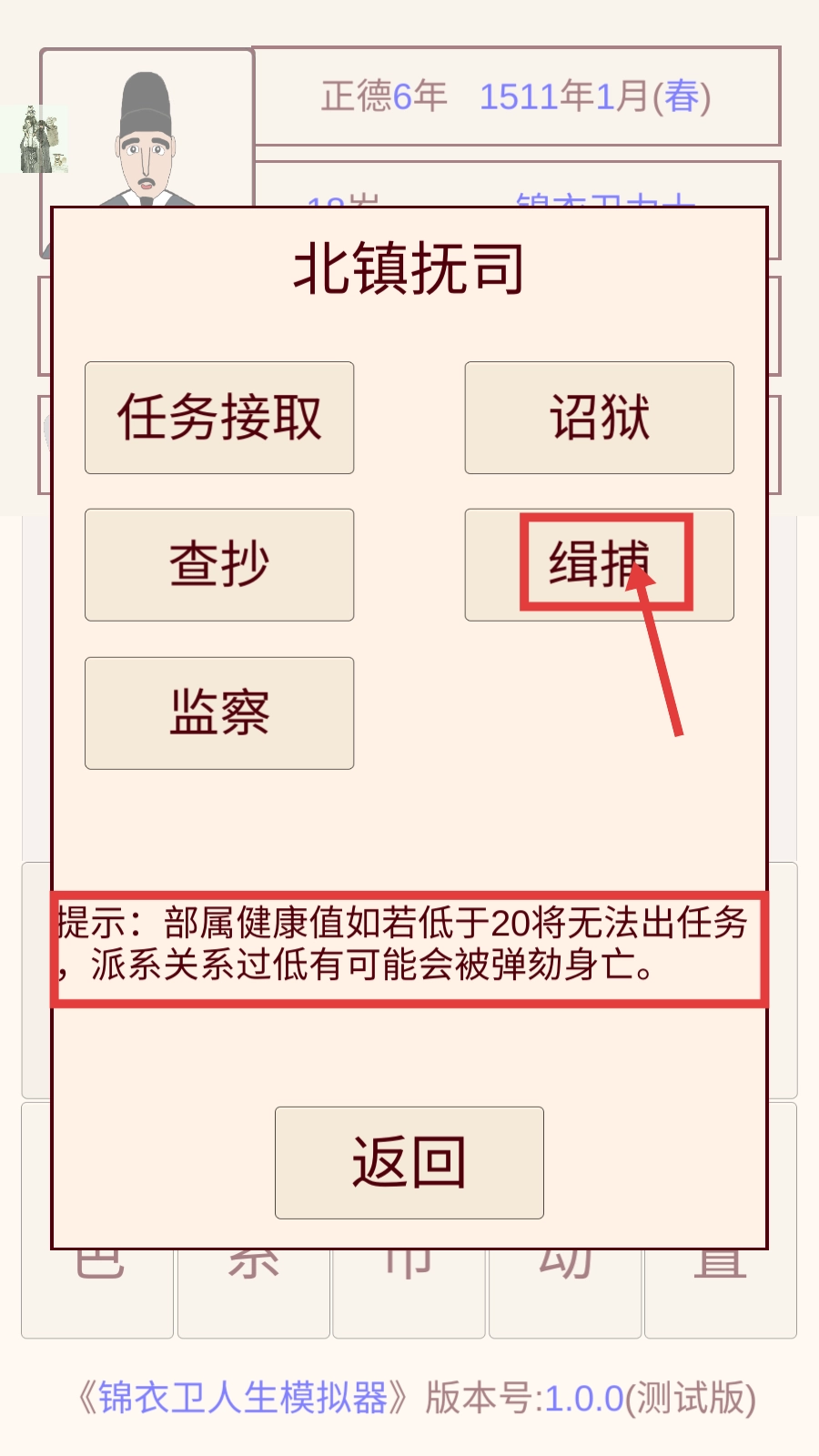 在【北鎮撫司】里挑選【緝捕】任務時,要留意部屬的健康值不能低于20,另外還要留意派系之間的關系,以防遭到彈劾。