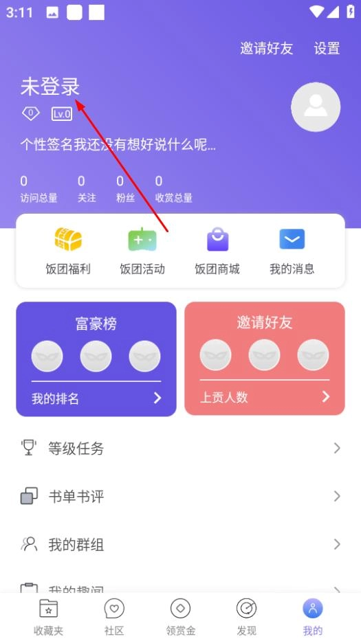 在飯團探書個人頁面,點擊未登錄,進入登錄界面。