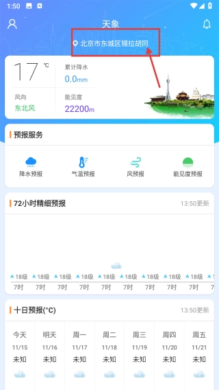 在地址搜索結果頁面,挑選鄭州市金水區的相關地址(比如河南大學鄭州校區),隨后進入天氣詳情頁面。