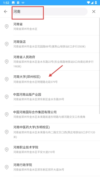在地址選擇頁面,點擊搜索框并輸入“河南”,即可進入地址搜索結果頁面。