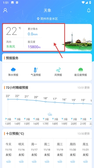 在天氣詳情頁面,可以查看鄭州市金水區的天氣信息,比如溫度22℃、風向東南風之類的內容。