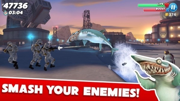 在《饑餓鯊進化》里,最開始解鎖的那條鯊魚,只能在海面附近活動——要么捕食落水的人類,要么追逐一些小型魚類為食。要是遇上海底的水母之類的生物,別說沒法吃掉它們了,反而會被蜇傷;稍微一不留神,血條就會見底,直接游戲結(jié)束。