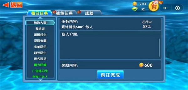 不氪金時想快速升級鯊魚,可通過簽到、看廣告和做任務(wù)來實現(xiàn)。點擊進入相關(guān)界面后,能查看任務(wù)進度,像精力旺盛、游戲分享這類任務(wù)往往在不經(jīng)意間就完成了,完成后還能領(lǐng)取不同數(shù)量的金幣或鉆石獎勵。