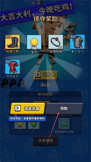 獲得第1名后,可領取戰票、戰靴、金幣等掠奪獎勵,點擊領取按鈕即可繼續游戲。