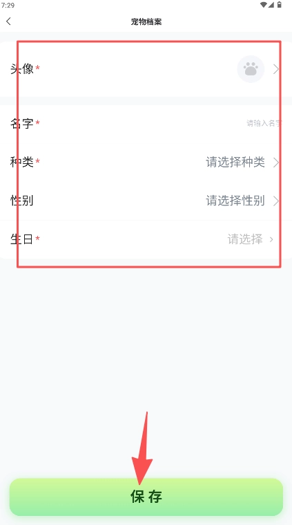 在寵物檔案編輯頁面填寫名字、種類、性別等必填信息后,點擊“保存”按鈕即可完成操作。