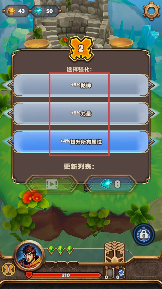 挑選強化屬性,像【+5%防御】【+5%力量】這類,來提升角色的能力。