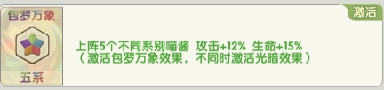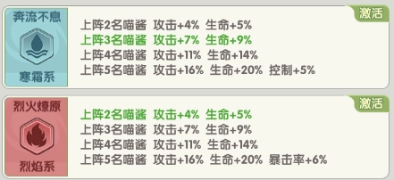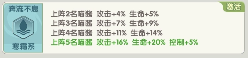 第二種思路是湊齊同系列的5張貓咪卡牌上陣,以此激活“奔流不息”的羈絆效果,從而獲得全額的傷害屬性加成。其他類型的貓咪卡牌組合也能觸發類似的羈絆機制,這套陣容在游戲后期比較常見,前期則很少有玩家會選擇使用。