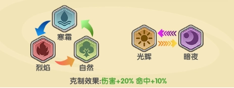 陣容的屬性克制關系如下:普通類型里,寒霜、烈焰、自然三者形成互相克制的循環;特殊類型中,光輝與暗夜互為克制關系。整體來看,這些克制關系可劃分為兩個不同的克制體系。當陣營間形成克制時,能觸發額外20%傷害加成與10%命中提升的效果。在推圖或跨服角斗玩法中,玩家可通過手動調整角色站位來對應克制關系,從而收獲意想不到的勝利。
