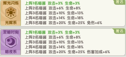 特殊類型的光輝與暗夜卡牌,只需上陣一張就能激活額外加成效果;整套共五張卡牌,各位玩家可自行搭配組合,核心是圍繞主力陣容開展培養,以此觸發不同的額外屬性加成。
