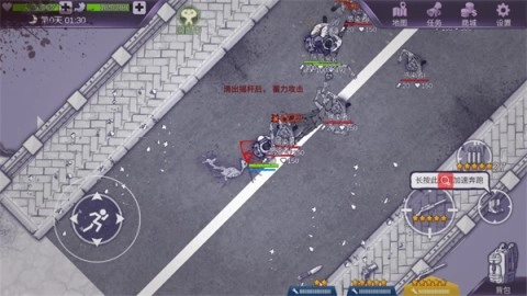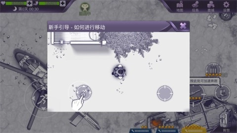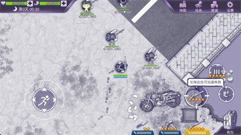 左側(cè)輪盤控制移動(dòng),右側(cè)長按以奔跑并使用槍械;