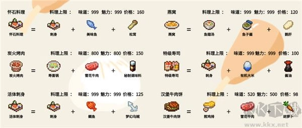 而菜品價格也是由八維圖的數(shù)值直接決定,每個食物都有著其價格、味道、魅力上限,因此在菜品研發(fā)上,選擇高上限的菜品往往會得到事半功倍的效果!