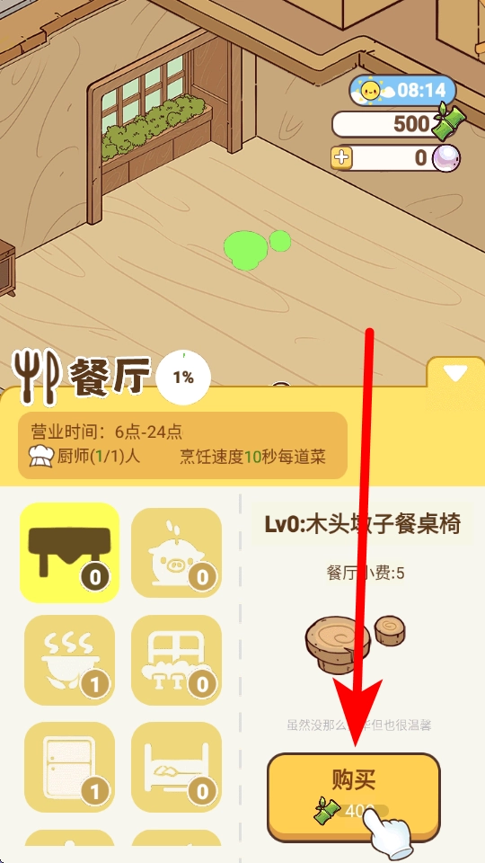 餐廳的布置是必不可少的環節,你可以利用已獲取的資源來購置桌椅之類的設施,像木頭墩子樣式的餐桌椅就很合適。完成布置后,不僅能讓餐廳的氛圍變得更加宜人,還能有效提高顧客支付的小費金額。