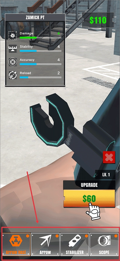 在游戲的初始界面里,有個標著UPGRADE的選項,通過它你能夠對弓箭的各類配件進行升級操作。