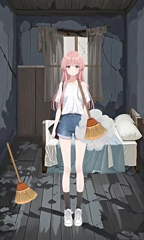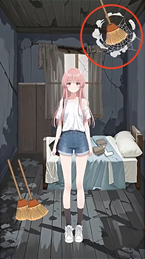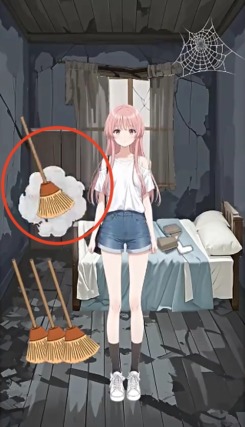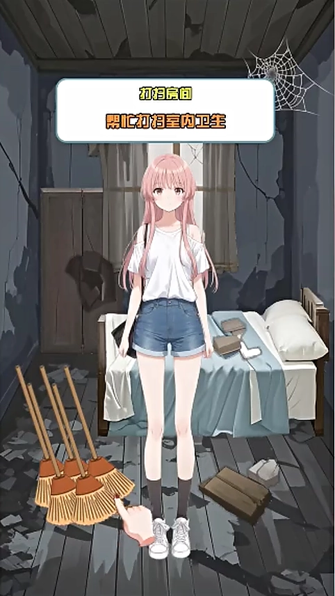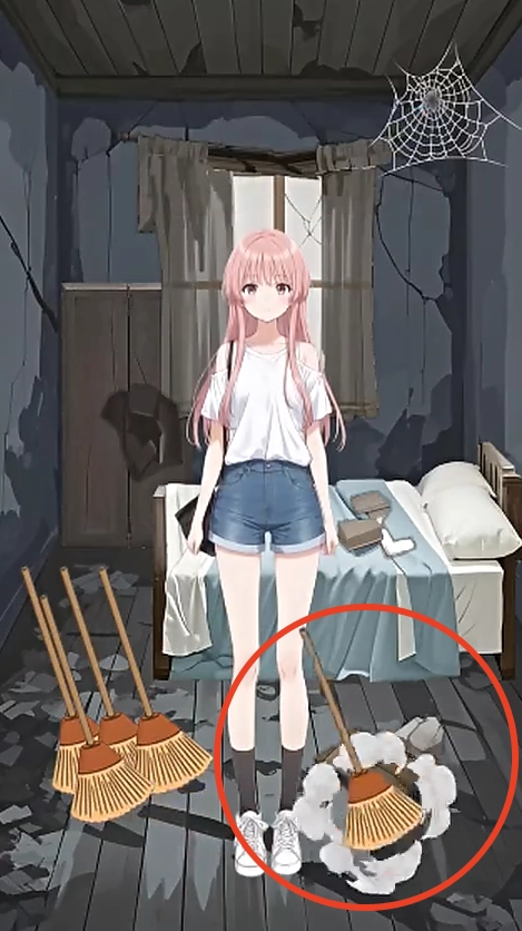 只需把左下角的掃把拖到要打掃的角落,就能開展清掃工作了,其中也包含女主左腳旁邊的雜物。