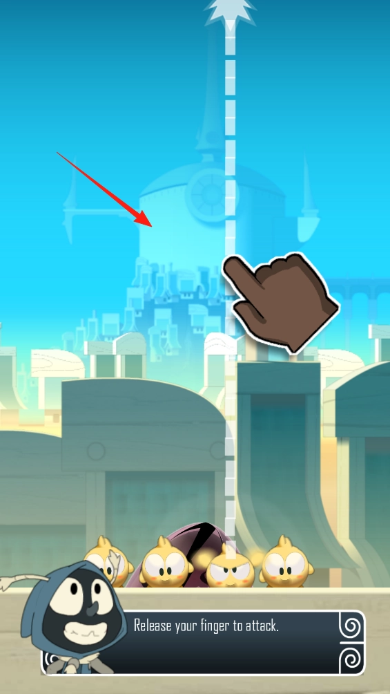 進入關卡有角色和小雞,還有豎線和手指提示,按住屏幕,順著豎線蓄力,松開手指發射攻擊,把小雞往前送,挑戰前面的障礙,看能不能順利通關。