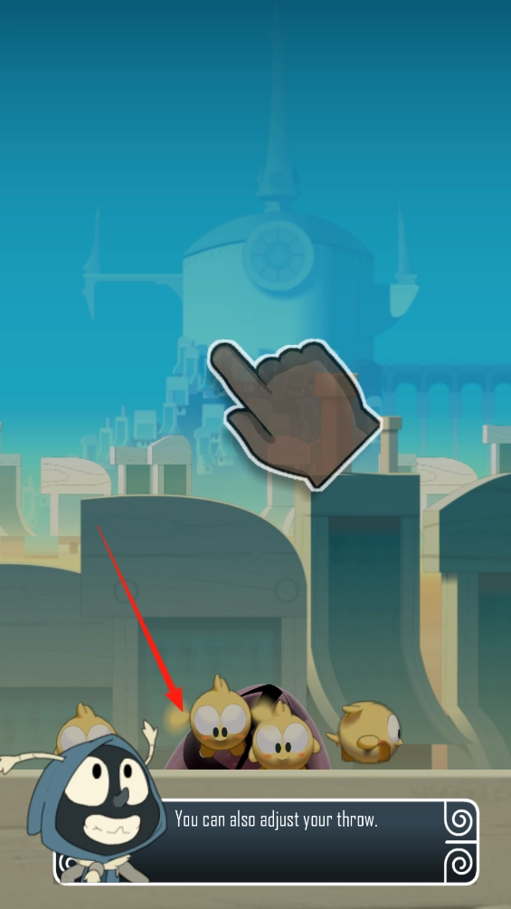 繼續關卡,手指提示能調整投擲,按住屏幕調整角度和力度,松開手指,讓小雞精準跳出去,避開危險收集道具,靠調整投擲,幫小雞闖過更多難關。