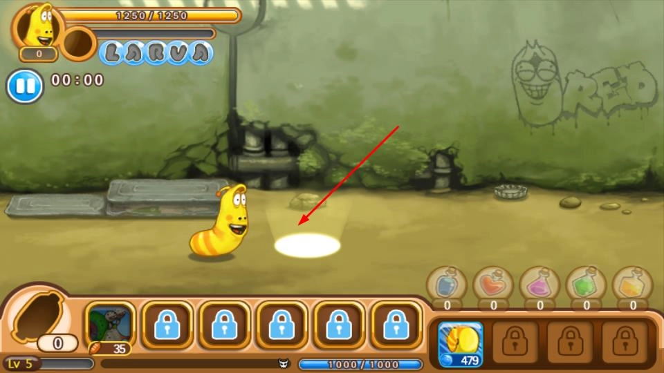 關卡內操控角色初始為黃蟲移動,點擊地面發光區域,觸發探索事件如道具獲取、敵人遭遇。