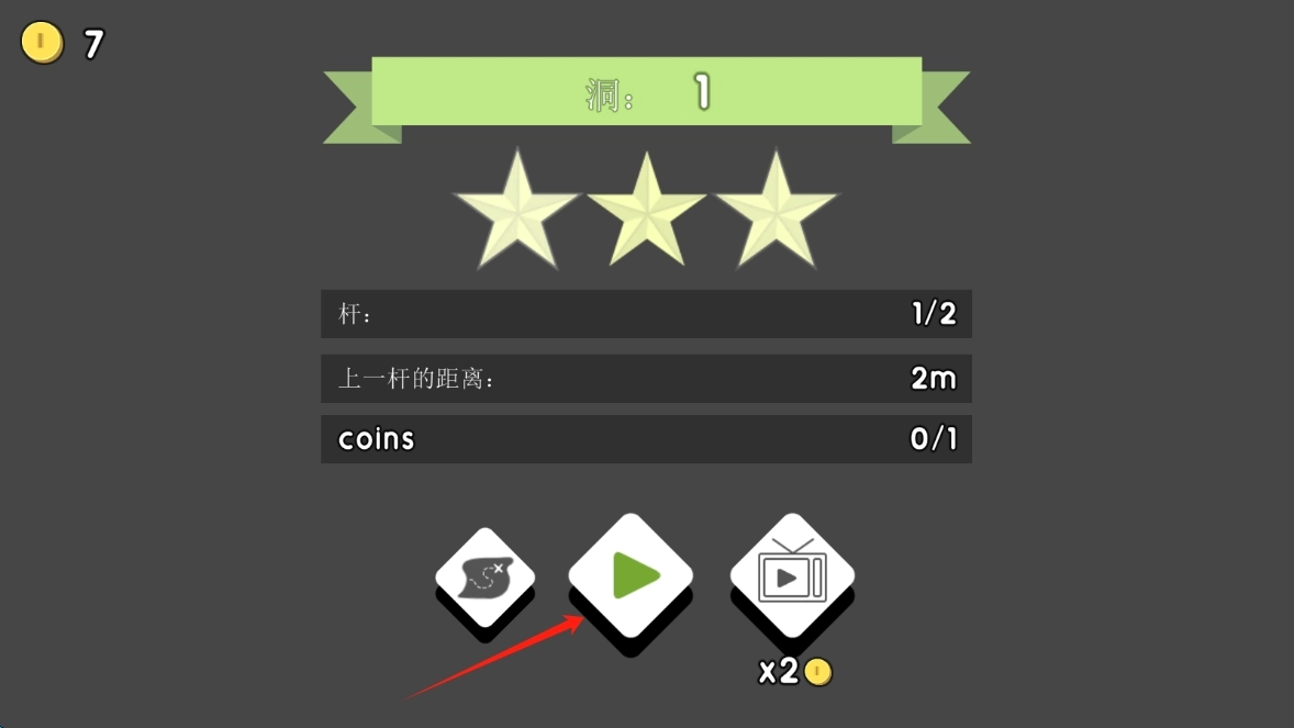 游戲結算界面,查看當前洞的星級評價、球桿使用數、上一桿距離及金幣收集情況。點擊綠色按鈕,繼續挑戰下一個洞,不斷提升游戲表現。