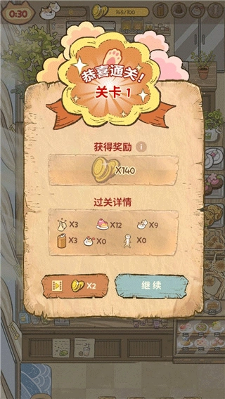 喵之料理大師游戲中每挑戰成功一關,都可以獲取相應的關卡資源獎勵
