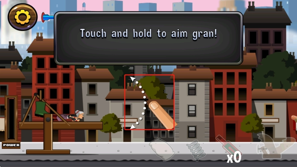 首先我們按提示長按屏幕,調整彈弓角度與力度,讓老奶奶沿虛線軌跡飛出,過程中避開建筑等障礙。