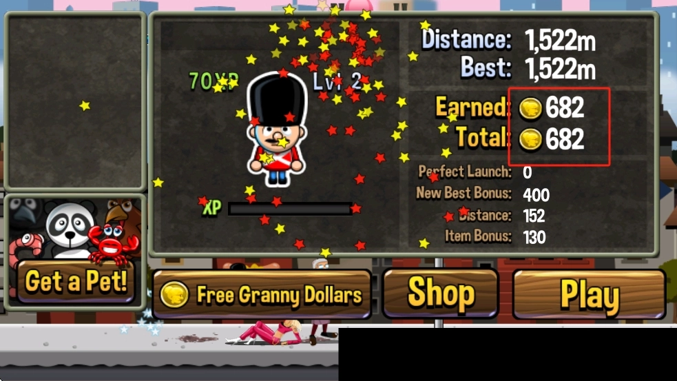關卡結束后收獲682金幣,可進入商店購買道具,也可以用金幣強化老奶奶的能力,挑戰更高的投擲距離。