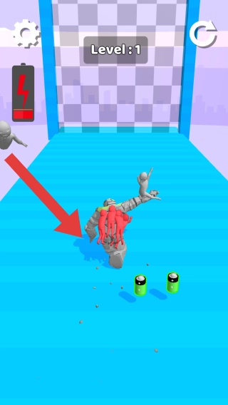 當(dāng)前處于Level:1,畫面里包含機(jī)器人角色、紅色敵人、綠色電池道具、電量顯示、重置按鈕等元素,這是動(dòng)作闖關(guān)類游戲的第1關(guān)戰(zhàn)斗場(chǎng)景。