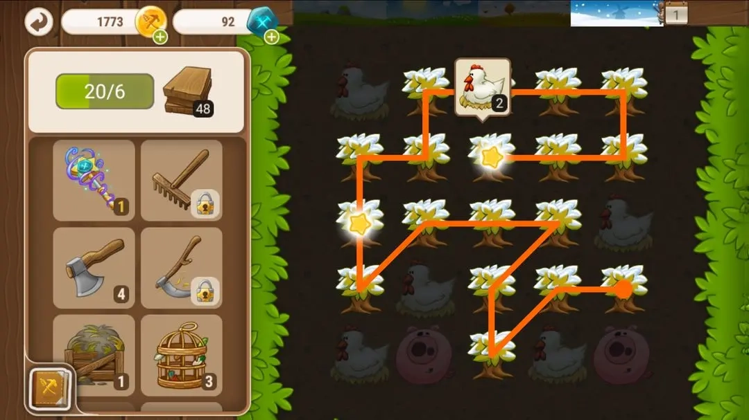 游戲里設(shè)有農(nóng)作物升級合成的機制。例如,一次性砍倒多棵大樹能解鎖母雞,收割到一定數(shù)量的草則可以生成水稻,這類升級設(shè)定讓原本的消除游戲過程更具挑戰(zhàn)性。