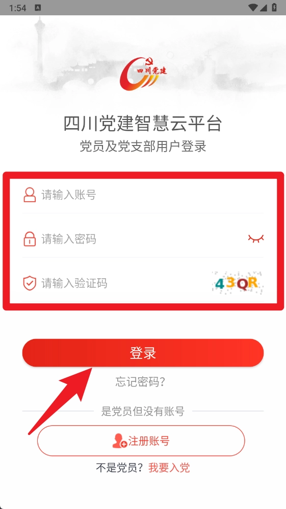 第一次打開四川黨建平臺時,在登錄頁面填寫賬號、密碼和驗證碼,然后點擊登錄按鈕進入平臺;要是還沒有賬號的話,可以先進行賬號注冊。