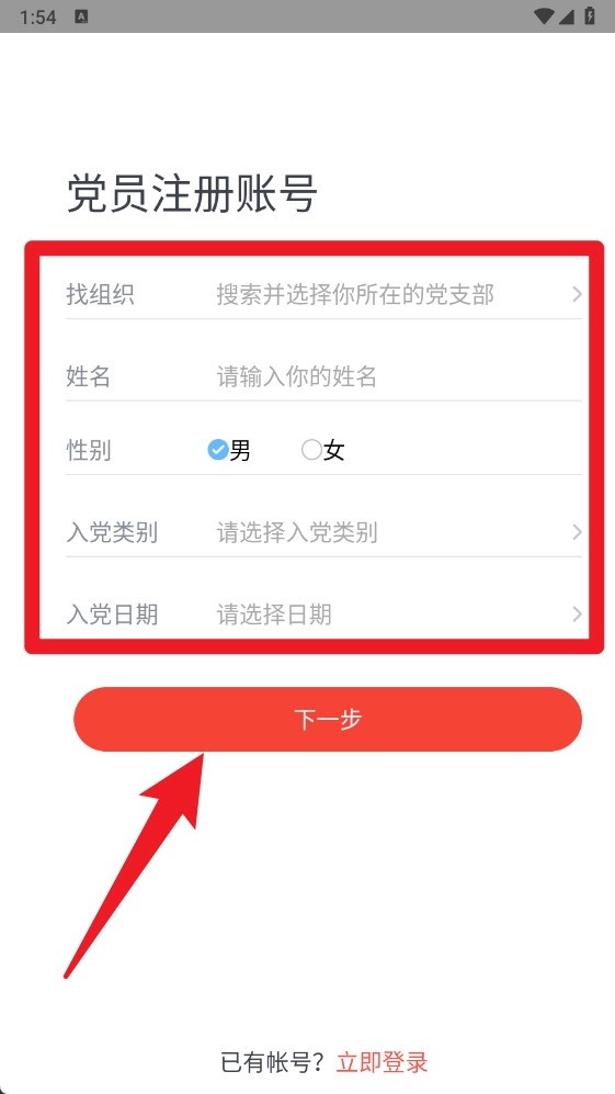 在賬號注冊頁面,依次填寫組織、姓名、性別、入黨類別以及入黨日期等相關信息后,點擊“下一步”按鈕即可完成注冊流程。