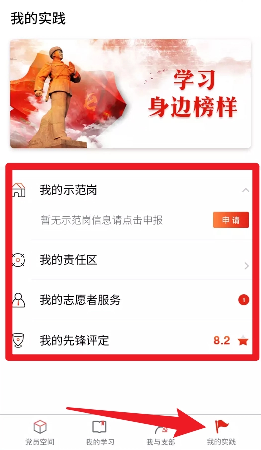 在我的實踐模塊里,能夠開展示范崗申報、查看責任區、參與志愿者服務以及進行先鋒評定,從而對黨員的實踐活動進行全方位記錄。