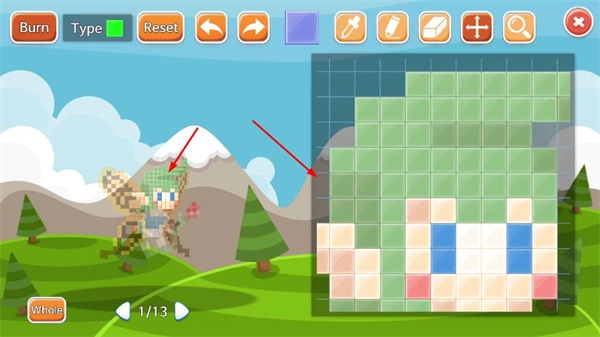 在角色編輯界面,能夠借助不同像素方塊的組合,對像素角色的外觀展開設計。